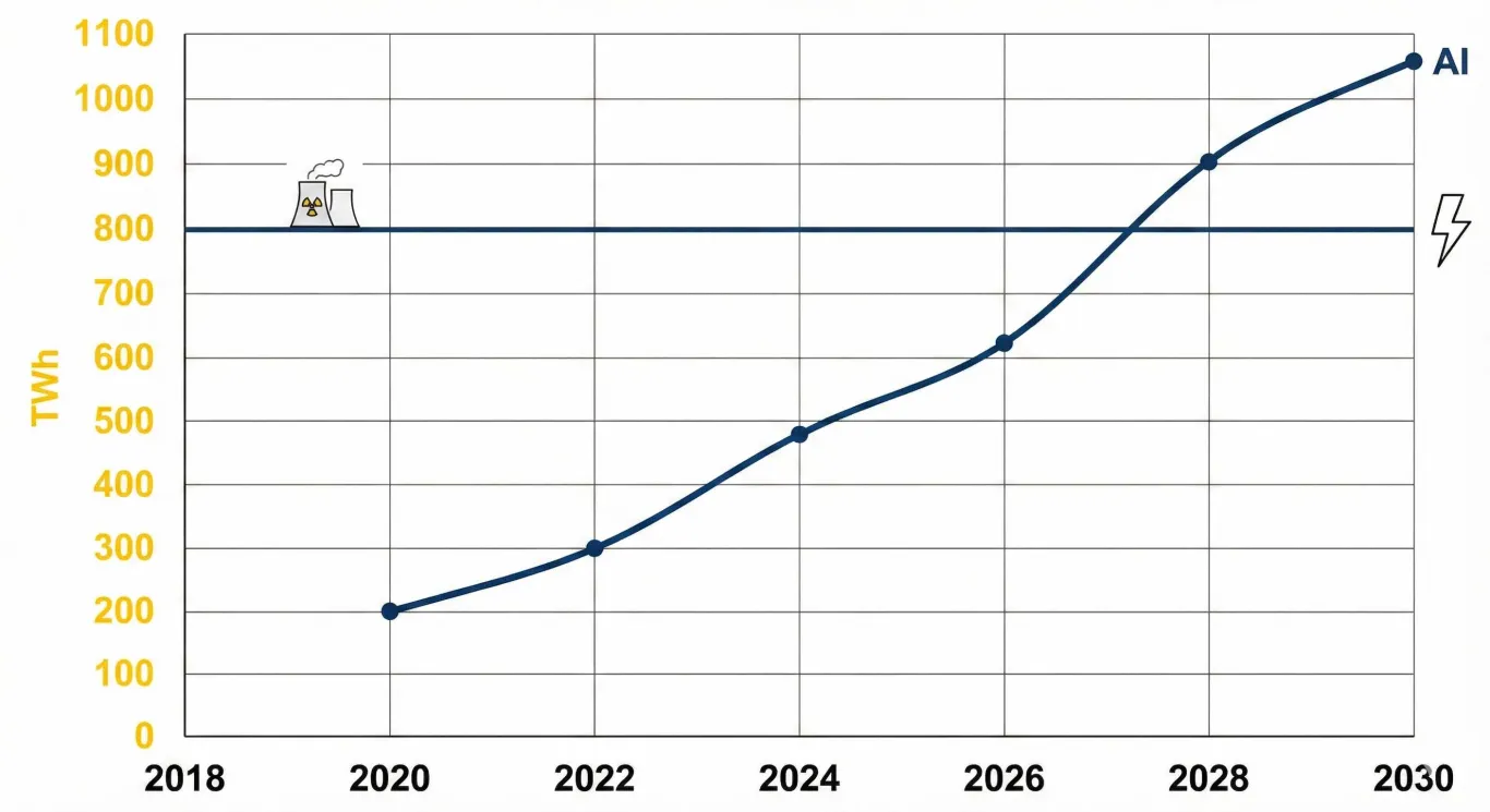 “Crée un graphique qui représente la consommation en énergie électrique de l’IA et la production moyenne d’électricité d’une centrale nucléaire (en TWh) en fonction du temps (en année). Palette : #F0F0C9 ; #F2BB05 ; #3423A6 ; #FFFFFF ; #000000 Fond : #F0F0C9 Production : #F2BB05 IA : #3423A6 Production : 804 TWh Consommation IA : 2020 : 200 2022 : 300 2024 : 480 2026 : 620 2028 : 900 2030 : 1050 Met des points "pop", animation fluide, vague sur la production, production dessinée en premier puis IA ensuite.”