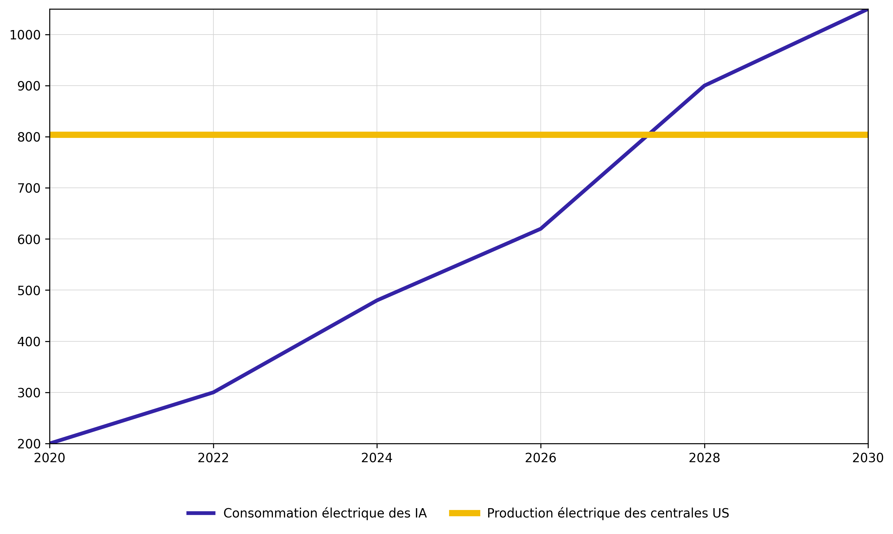 "Crée un graphique en ligne montrant la consommation électrique des IA (en bleu 3px #3423A6)